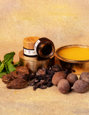 Made with Shata Dhauta Dhrita (100 times washed pure karampasu ghee), Saffron (Kesar Varnya Gana Decoction), Red sandalwood, Nalpamaradi Keram, Manjista extract, Cocoa butter, Varnyam oil, Turmeric essential oil, Beeswax, Shea butter.